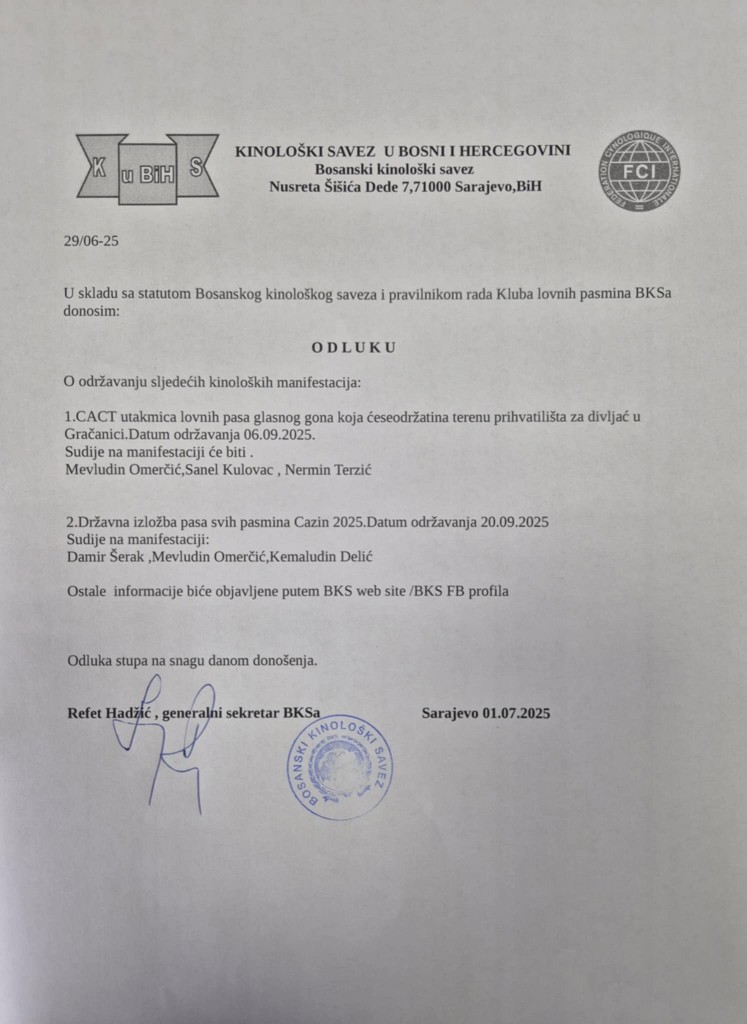 U skladu sa statutom Bosanskog kinoloskog saveza i pravilnikom rada Kluba lovnih pasmina BKSa donosim: